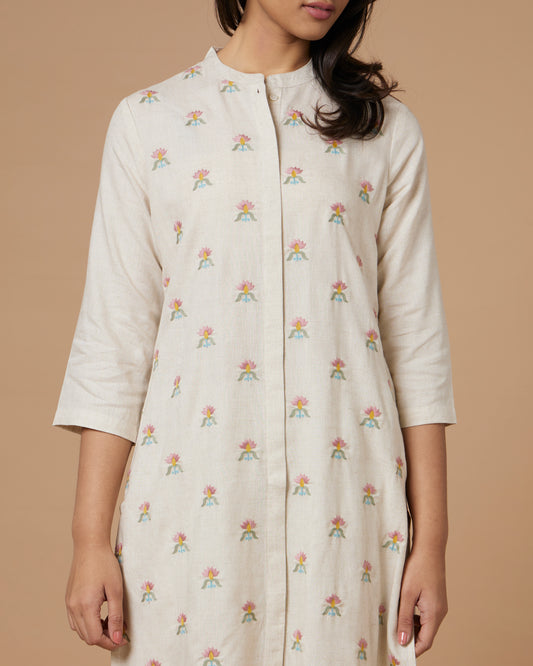 Handblock Pure Linen Kurta with Embroidery details-Pista