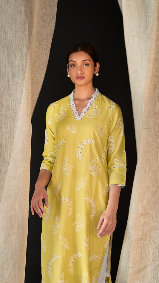 Yellow Linen Schiffli Cutwork Kurta