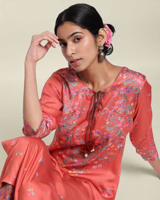Rust Red Floral Tencel Kurta Set