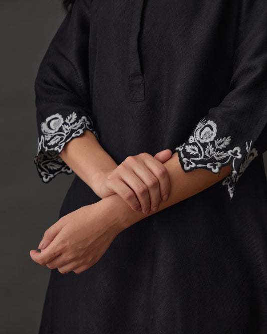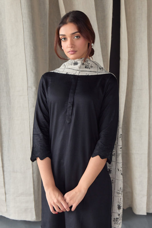 Hand Scalloped Black Kurta set with Tonal Embroidery
