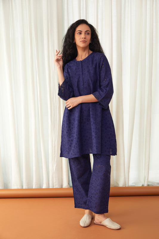 Flared Midnight Blue Cutwork Cotton Co-ord Set